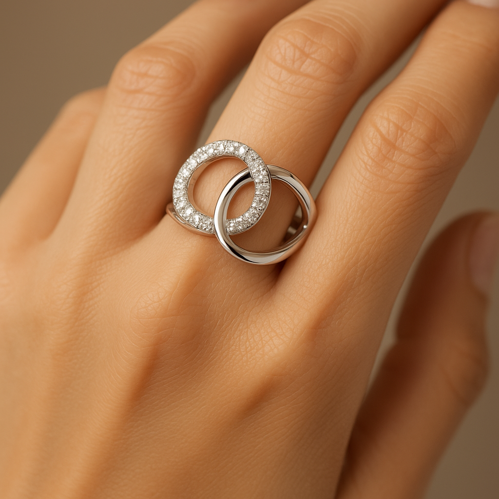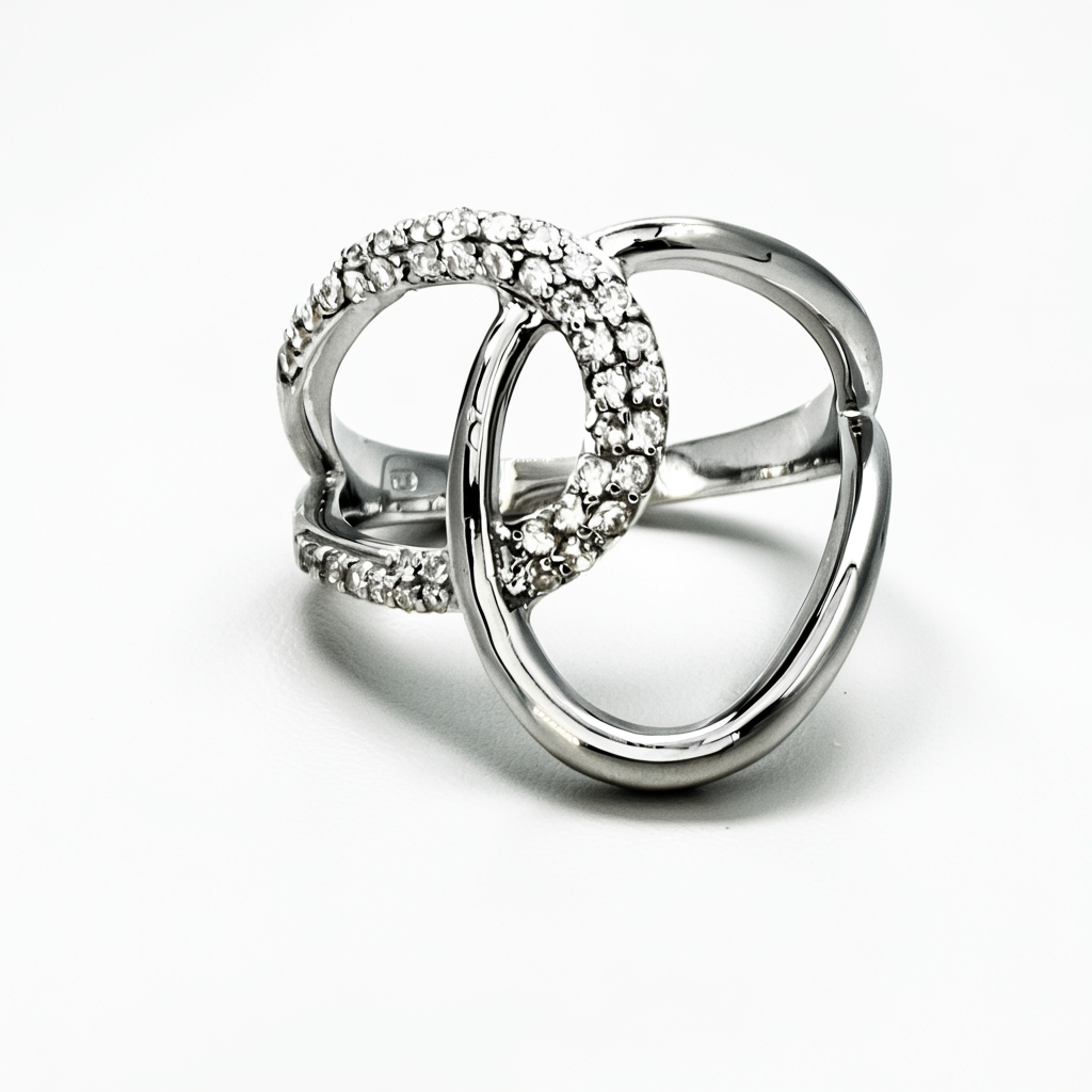 A sculptural, modern statement ring crafted in 18K white gold, featuring two overlapping open circles—one polished, one pavé-set with natural round brilliant diamonds. This design plays with contrast and negative space, creating a look that’s both bold and refined.