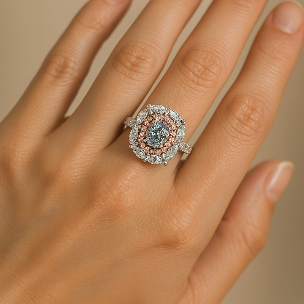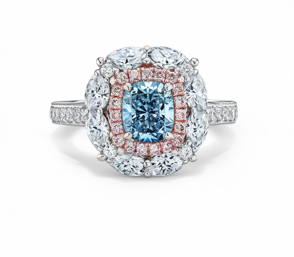 This elegant ring features a floral-inspired arrangement of brilliant round diamonds, centered around a rare blue diamond—an exceptional gemstone known for its vivid hue and rarity. Intricately set in lustrous white gold, the layered design mimics the petals of a blooming flower, enhanced by a diamond-accented split band. As part of our limited high jewelry collection for spring, this ring is a one-of-a-kind piece sourced with care and intended for true connoisseurs. Customization available upon request.
