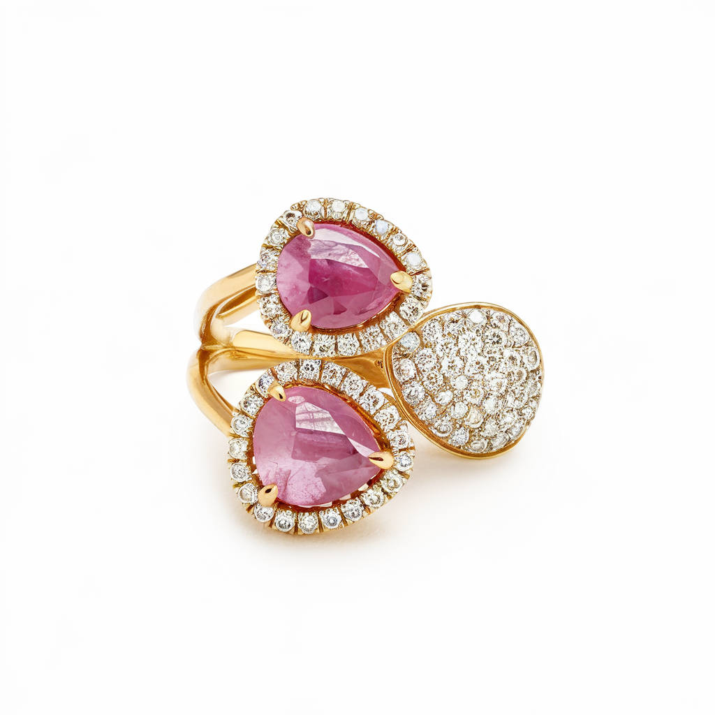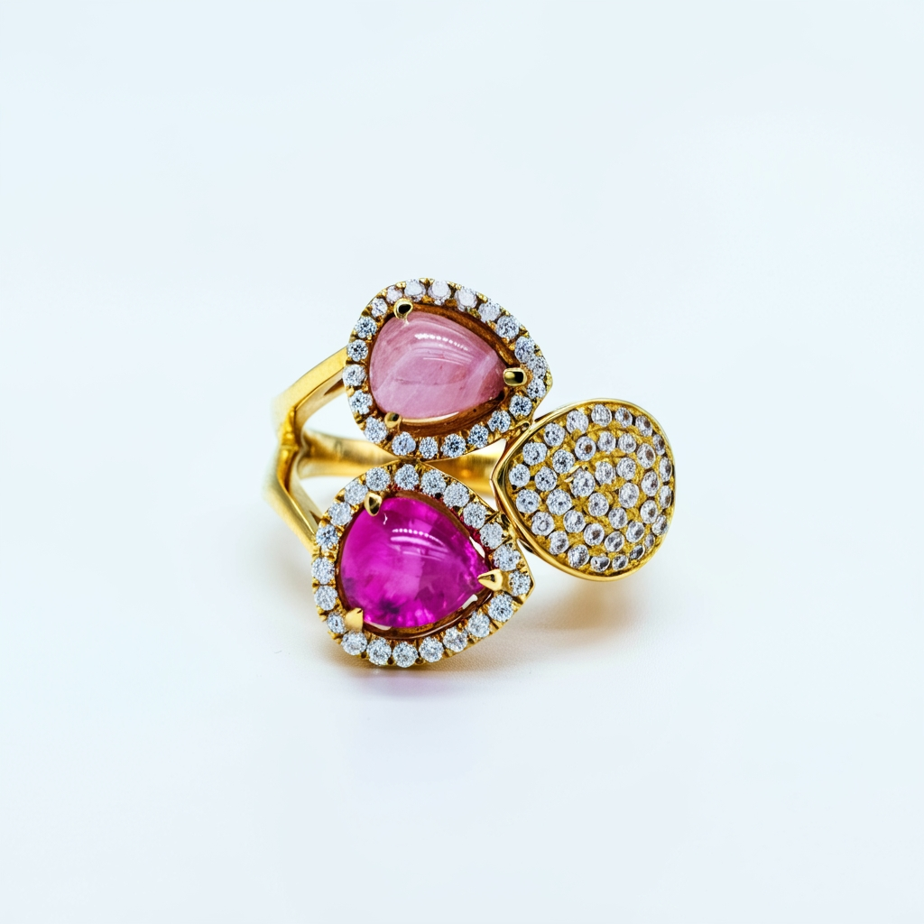 This stunning ring showcases two pear-shaped cabochon-cut tourmalines totaling 3.48 carats, each framed in a halo of brilliant round diamonds. A third pear-shaped silhouette, fully pavé-set with diamonds, completes the trio design—adding symmetry and sparkle. Crafted in 18K yellow gold, this elegant piece offers a bold yet refined aesthetic, perfect for making a statement. Customizable upon request.