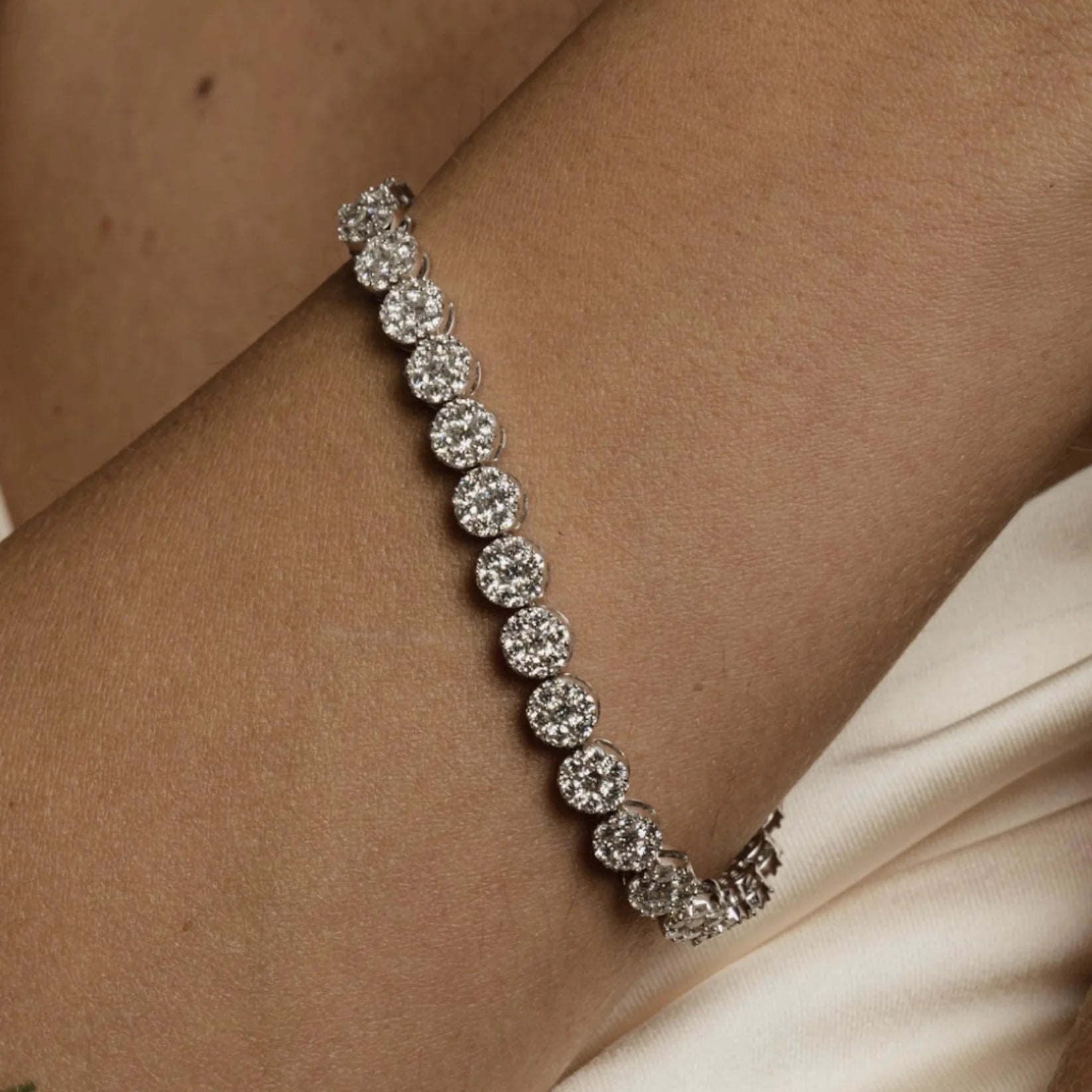 Crafted in polished 18k white gold, this diamond cluster bracelet showcases round brilliant diamonds arranged in elegant pavé-set domes. Each link is meticulously crafted to catch and reflect light from every angle, creating a soft, romantic shimmer.