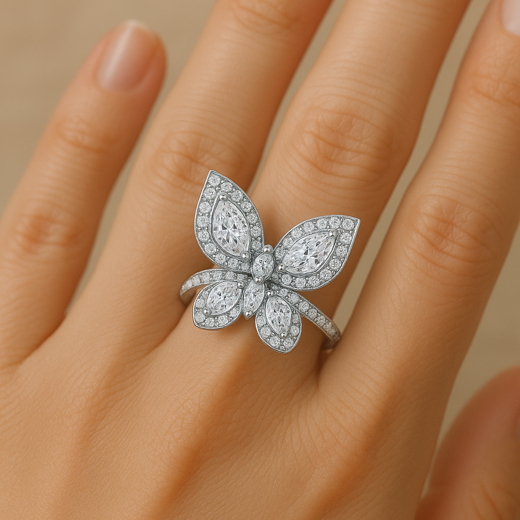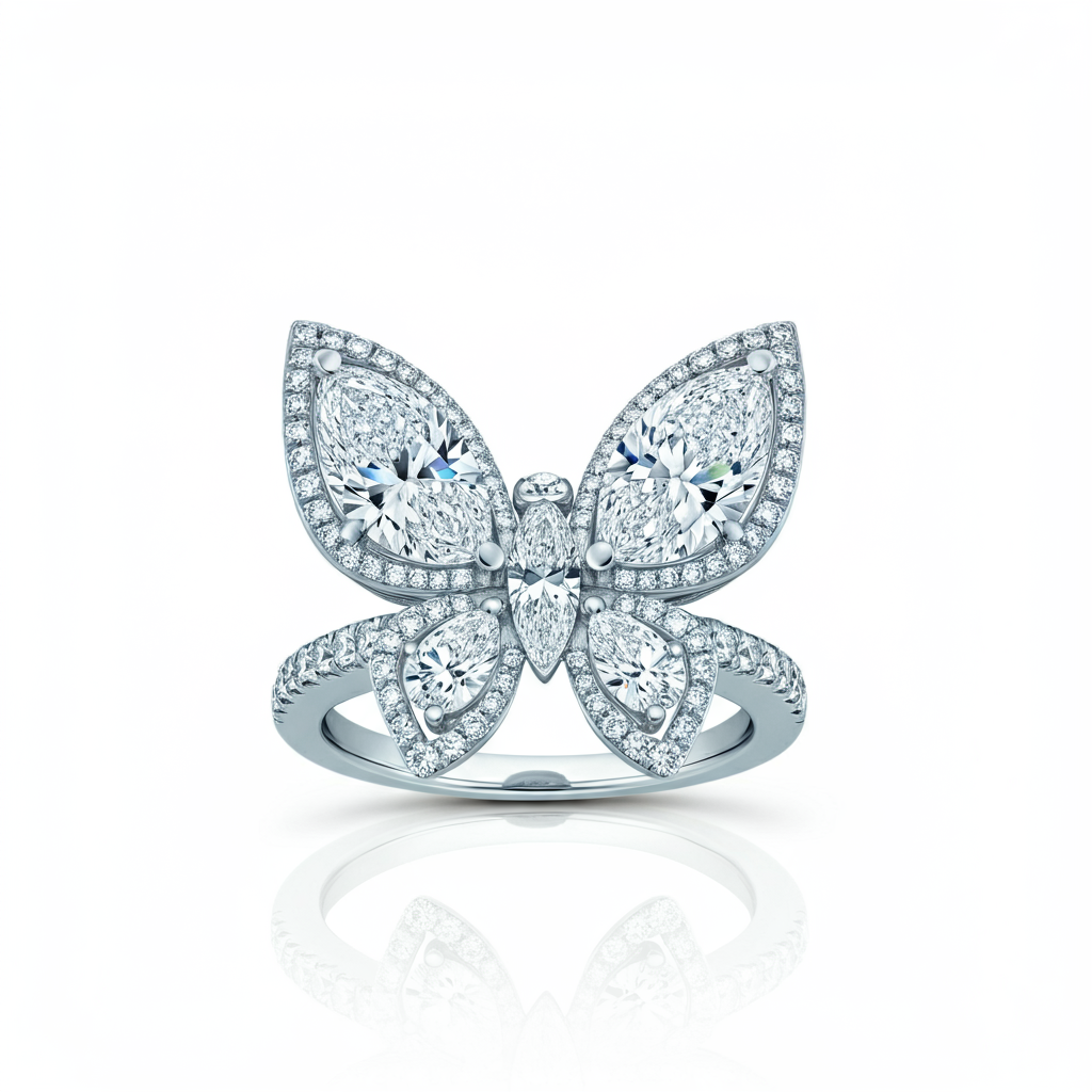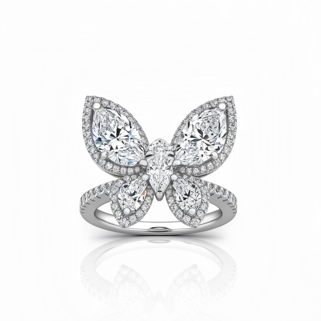 This enchanting butterfly ring is a graceful celebration of transformation and beauty. Crafted in 18K white gold, it features marquise and pear-shaped diamonds forming delicate wings, each outlined by a halo of pavé-set diamonds. The band is also adorned with fine diamonds, adding brilliance from every angle. A statement piece from our Spring collection, this ring can be customized with your choice of gemstones or metal finish for a personal touch.
