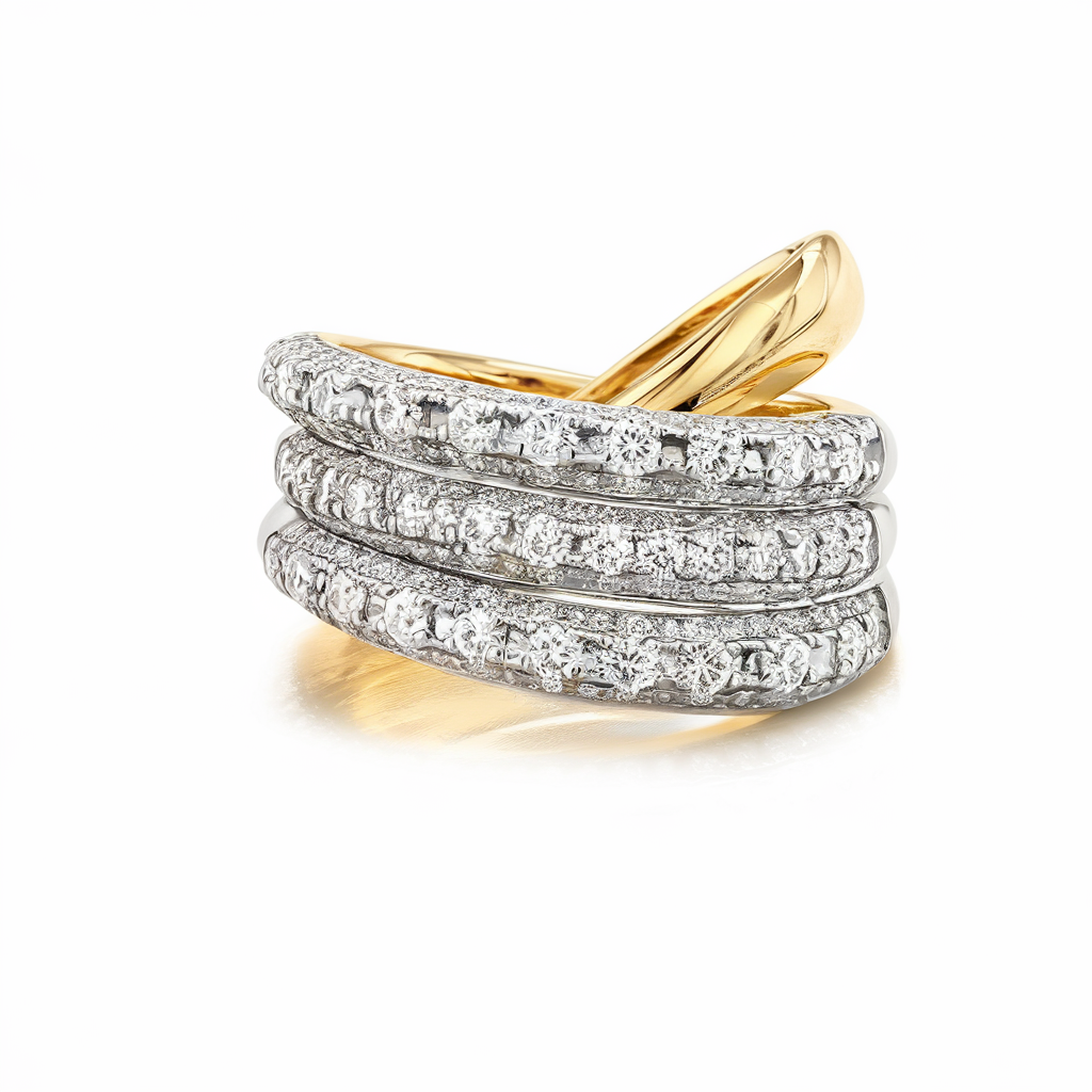 An effortlessly chic design, this bold crossover band blends the richness of 18k yellow gold with pavé-set round diamonds in white gold for a layered, multidimensional look. The ring features five rows of shimmering diamonds totaling 2.85ct, each one set to maximize brilliance.
