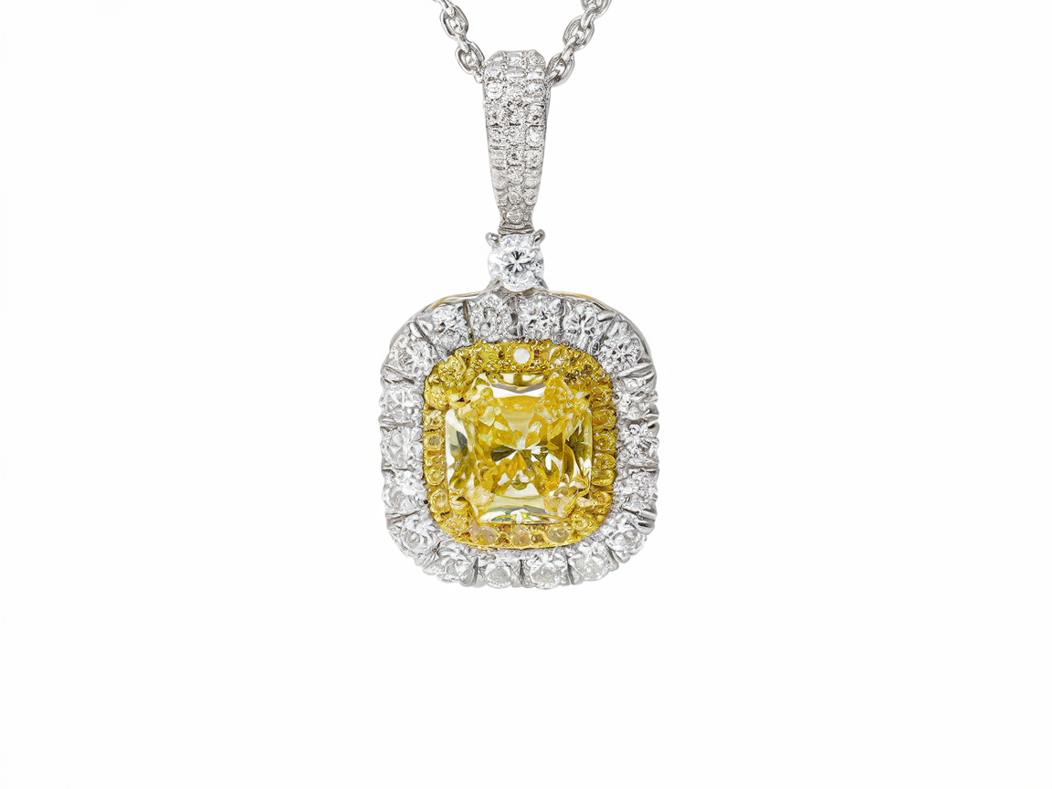This elegant and dainty necklace features a 0.58ct natural cushion-cut yellow diamond at its center, radiating warmth and sophistication.